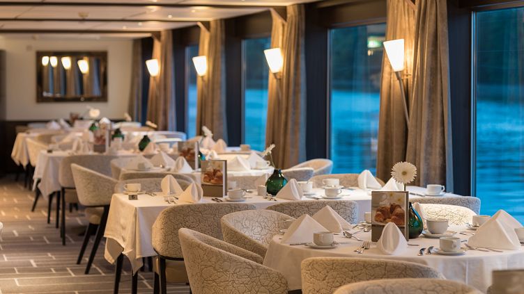 Das Panorama Restaurant auf dem Strauss-Deck lädt zu einzigartigen kulinarischen Erlebnissen ein. Am Morgen steht zum Frühstück ein reichhaltiges Buffet bereit, während zum Mittag- und Abendessen mehrgängige Menüs serviert werden.