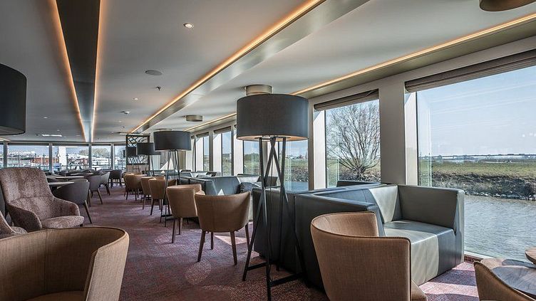 Eine Bar befindet sich in der lichtdurchfluteten Panorama Lounge auf dem Oriondeck.