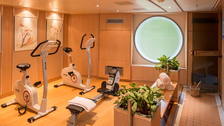 Im Wellness- und Fitnessbereich auf dem Mitteldeck der MAXIMA können Sie sich rundum wohlfühlen. Genießen Sie zum Beispiel einige wohltuende Momente in der geräumigen Sauna oder auch im beheizten Indoor-Whirlpool.