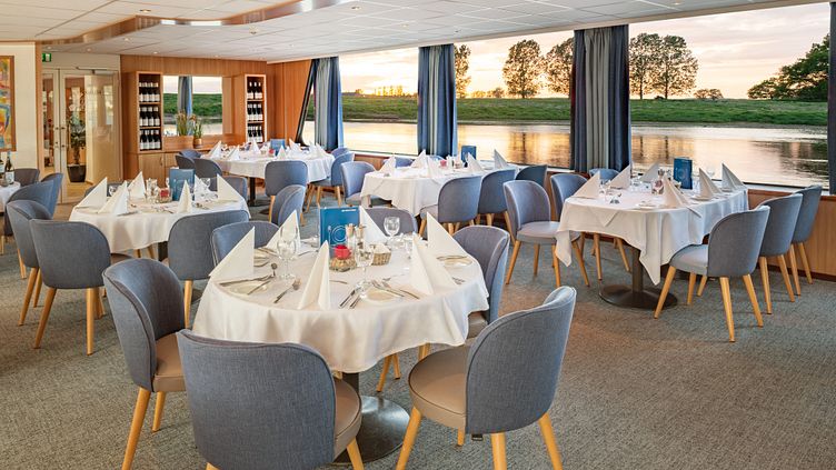 Genießen Sie traumhafte Aussichten und geschmackvolle Menüs im Panorama Restaurant der RHEIN SYMPHONIE. Während am Morgen ein umfangreiches Frühstücksbuffet lockt, erwarten Sie zum Mittag- und Abendessen mehrgängige servierte Menüs.