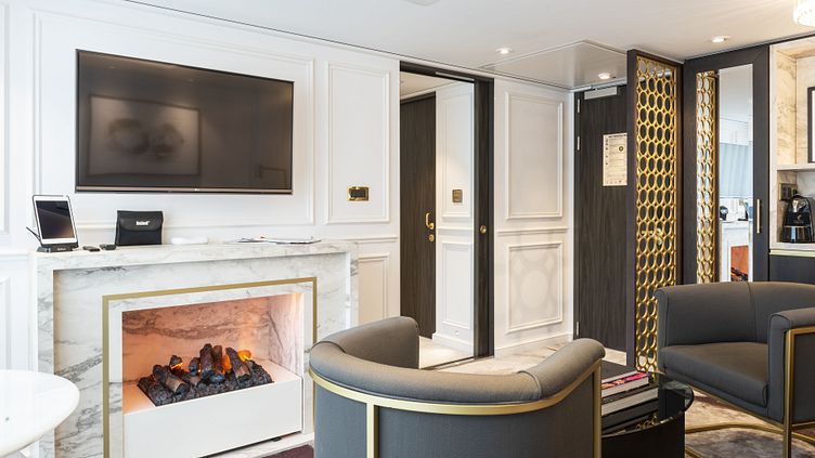 - Ausstattung: Schlafzimmer mit Kingsize-Bett (zum Fenster gerichtet) und -Kissen, Sessel und Kaffeetisch, Wohnbereich mit Schreibtisch/Schminktisch, Minibar, Espresso-Kaffeemaschine, Fernseher, begehbarem Kleiderschrank, individuell regulierbarer Klimaanlage, Badezimmer mit Regendusche, zwei Waschbecken und WC, Fön, Frotteebademänteln, Hausschuhen, hochwertigen Pflegeprodukten