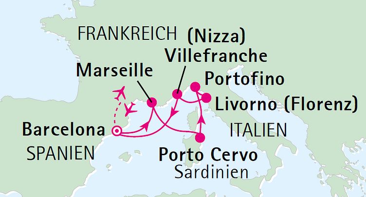 - inkl. Lufthansa-Linienflüge von Frankfurt oder Hamburg nach Barcelona und zurück sowie Transfers vom Flughafen zum Hafen und zurück. Innerdeutsche Anschlussflüge p.P. Aufpreis € 120,- (auf Anfrage/nach Verfügbarkeit)