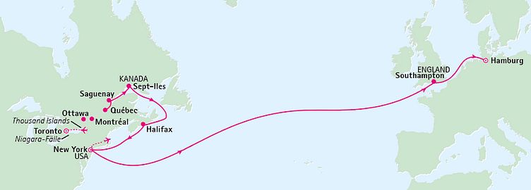 Erleben Sie eine wunderbare Reise – zur schönsten Jahreszeit, zum Indian Summer, wenn die Wälder bunt, das Licht golden und der Himmel azurblau ist. Zunächst unternehmen Sie eine Rundreise ab Toronto durch den Osten Kanadas. Mit den imposanten Niagarafällen, der bezaubernden Region der „Thousand Islands“ und Montréal erwarten Sie fantastische Eindrücke. In Québec gehen Sie an Bord der QUEEN MARY 2. Freuen Sie sich auf traumhafte Landschaften am Sankt-Lorenz-Strom, vorbei an historischen Häfen und malerischen Leuchttürmen bis hin nach New York! Und dann haben Sie die Wahl: Nach einer spannenden Stadtrundfahrt fliegen Sie entweder zurück nach Deutschland – oder Sie bleiben an Bord Ihrer „Königin“ und lassen sich nach der klassischen Transatlantik-Route von ihr nach Hause bringen.