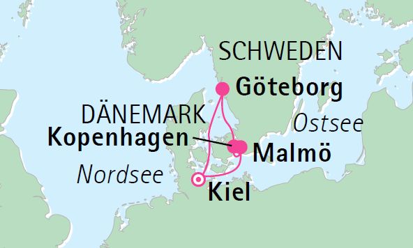 Diese Kreuzfahrt ist genau das Richtige für all diejenigen, die ein wenig Ostsee-Luft schnuppern möchten, Abwechslung lieben und jeden Tag unvergessliche Eindrücke sammeln möchten. Denn Langeweile suchen Sie hier vergebens! Von Kiel aus steuern Sie Göteborg an und erleben dort die entspannte Lebensweise der Schweden unmittelbar. Gelassen geht es in Dänemark weiter: In Kopenhagen verweilen Sie sogar zwei Tage, damit Sie ausreichend Zeit für Hygge und bleibende Erinnerungen haben! Im Anschluss werden Sie in Malmö feststellen, dass die beiden skandinavischen Länder vor allem eins gemeinsam haben: ihre faszinierende Vielseitigkeit!