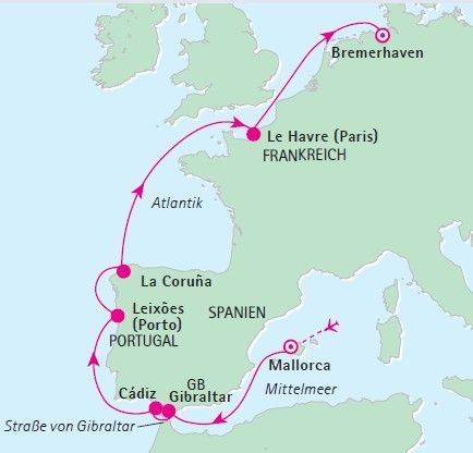 Ab Palma de Mallorca (Spanien) bis Bremerhaven (Deutschland)