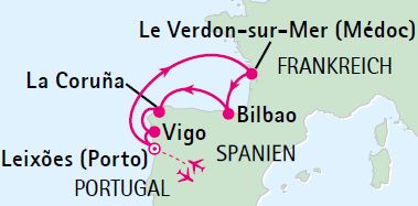 Beginnen Sie Ihre Reise mit einem besonderen Vorprogramm in Porto: Genießen Sie die lebendige Hafenstadt, besuchen Sie ein traditionsreiches Weingut und lassen Sie sich bei einer Weinprobe von den edlen Tropfen des Douro-Tals verführen. An Bord der Mein Schiff 6 geht es anschließend entlang der faszinierenden Westküste Europas. Entdecken Sie die Kulturschätze Bilbaos mit dem berühmten Guggenheim-Museum, flanieren Sie durch die eleganten Straßen von Bordeaux und lassen Sie sich in La Coruña von der Schönheit Galiciens verzaubern. Auch Vigo mit seiner maritimen Atmosphäre wird Sie begeistern.