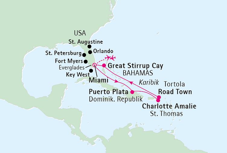 Diese einzigartige Reisekombination startet mit einer Florida-Rundreise. Von Miami aus fahren Sie nach Orlando, wo Sie das weltberühmte Kennedy Space Center besuchen können. Ein Tagesausflug nach St. Augustine begeistert mit historischem Flair. Weiter geht es über St. Petersburg nach Fort Myers, bevor eine spannende Bootstour durch die Everglades folgt. Von Florida City reisen Sie nach Key West, Wahlheimat bekannter Schriftsteller. Zurück in Miami erleben Sie eine Orientierungsfahrt und einen Hotel-Aufenthalt am traumhaften Miami Beach. Anschließend startet Ihre Kreuzfahrt mit der Norwegian Aqua zu karibischen Highlights: Erleben Sie beim Schnorcheln die bunte Unterwasserwelt der Karibik, sowie die vielfältige Flora zum Beispiel auf St. Thomas oder Tortola. Zurück in Miami unternehmen Sie noch eine Stadtrundfahrt.