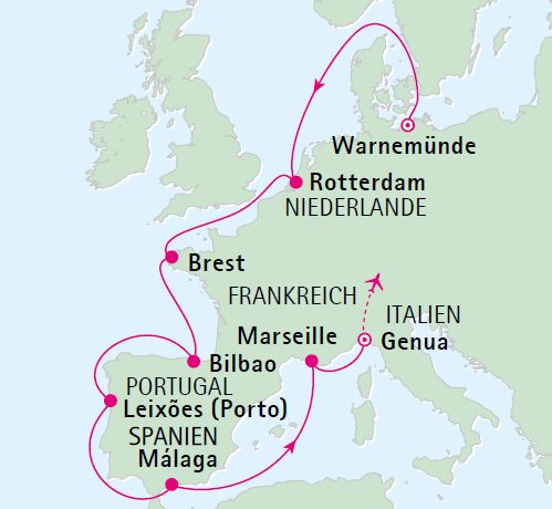 Was für eine Reise! Von der Ostsee, in die Nordsee, ab durch den Ärmelkanal, die Atlantikküste entlang bis ins Mittelmeer – einfach herrlich. Stehen Sie an Deck, atmen Sie tief ein, genießen, „erschnuppern“ und spüren Sie die unterschiedlichen Meere. Von kräftig und rau bis sanft und von der Sonne geküsst. Freuen Sie sich u.a. auf Brest in der malerischen Bretagne, gehen Sie in Bilbao ins berühmte Guggenheim-Museum und trinken Sie in Portugal einen vollmundigen Portwein. Málaga bezaubert durch andalusischen Charme, bevor Sie mit Marseille Frankreich im Süden erkunden. Gut gelaunt und mit vielen neuen Impressionen treten Sie von Genau aus die Heimreise an.