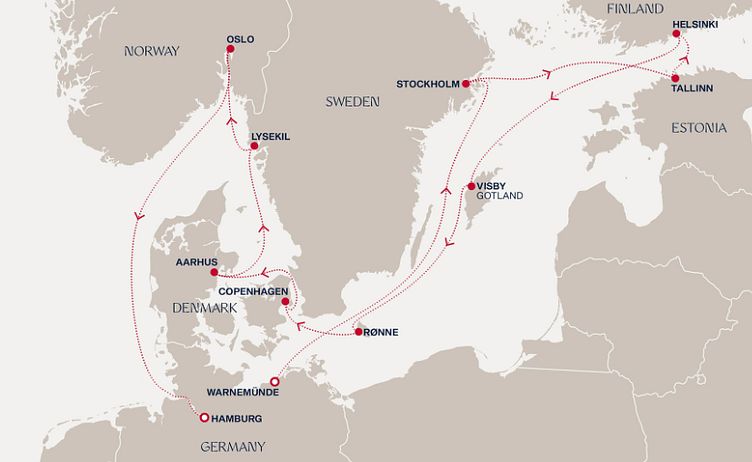 Von Warnemünde aus geht die Reise in Richtung Norden nach Stockholm, wo Sie zwei Tage lang schimmernde Wasserstraßen und kulturelle Schätze erkunden können. Schlendern Sie durch die märchenhaften Straßen Tallinns und entdecken Sie Helsinkis Mischung aus maritimer Schönheit und kreativem Design. Auf Gotland umrahmen die mittelalterlichen Mauern von Visby eine Stadt voller Legenden. Rønne hingegen lädt zum Entschleunigen ein. Kopenhagen besticht durch seine zeitlose Eleganz und Aarhus wird Sie mit seiner pulsierenden Kulturszene beeindrucken. Weiter geht es anschließend zur zerklüfteten Küste von Lysekil und den Fjorden von Oslo, bevor Sie Hamburg erreichen.