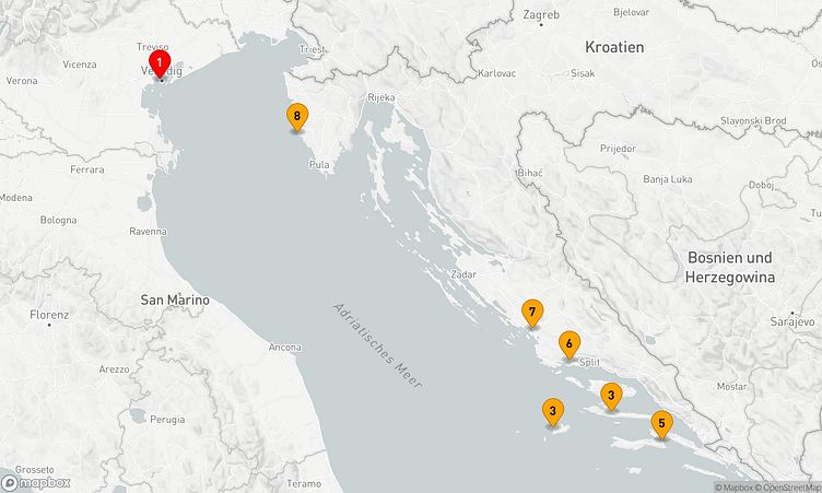Die Reiseroute beginnt am 17. August 2026 in Venedig (Italien) und führt Sie vom 17. August 2026 bis zum 25. August 2026 (8 Tage) nach Venedig (Italien).