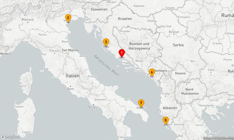 Die Reiseroute beginnt am 16. Mai 2026 in Split (Kroatien) und führt sie vom 16. Mai 2026 bis zum 23. Mai 2026 (7 Tage) nach Split (Kroatien).