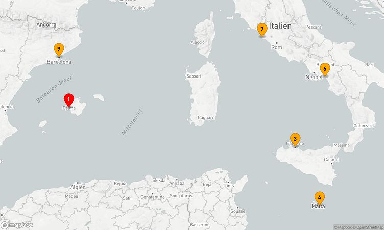 Während Ihrer Reise besuchen Sie unter anderem die Häfen von Palma de Mallorca, Palermo und Salerno, wo faszinierende Einblicke in Land und Kultur auf Sie warten.