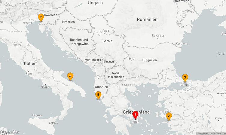Die Route startet am 11. November 2026 in Athen (Piräus) (Griechenland) und führt Sie vom 11. November 2026 bis zum 17. November 2026 (6 Tage) nach Triest (Italien).
