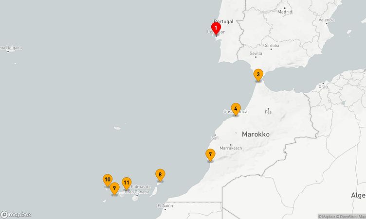 Während der Reise besuchen Sie unter anderem die Häfen von Lissabon, Casablanca und Arrecife / Lanzarote, die Ihnen spannende Eindrücke und einzigartige Entdeckungen bieten.
