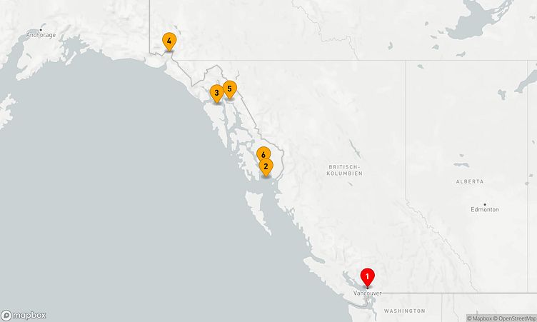 Ihre Reise startet in Vancouver (Kanada). Am 16. Mai 2027 legen Sie ab und erreichen nach 7 Tagen, am 23. Mai 2027, den Zielhafen Vancouver (Kanada).