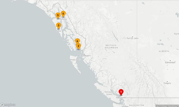 Während der Route halten Sie unter anderem in den Häfen von Vancouver, Inside Passage und Juneau, um in das Flair und die Besonderheiten der Umgebung einzutauchen.
