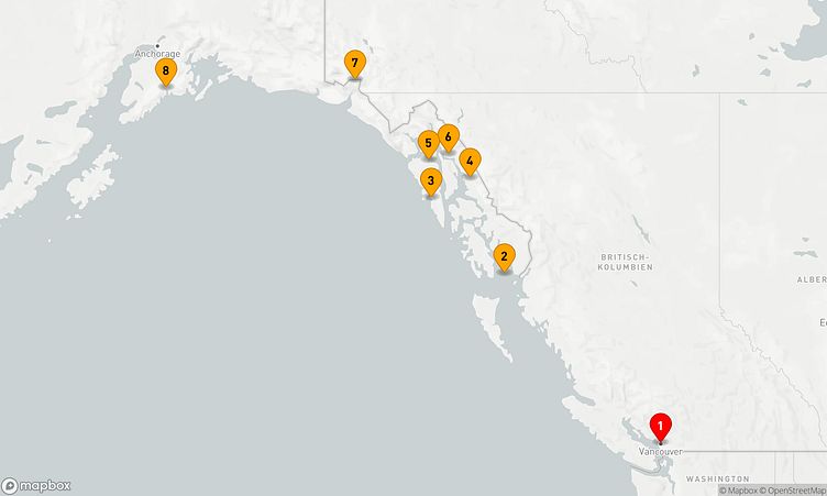 Auf dieser Reise erwarten Sie Stopps in den Häfen von Vancouver, Inside Passage und Endicott Arm, wo Sie lokale Highlights und unvergessliche Eindrücke sammeln.