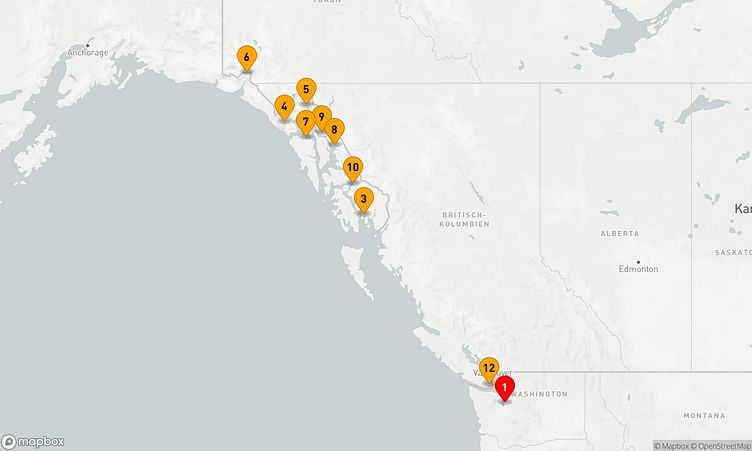 Nach Ihrem Start am 21. Mai 2026 in Seattle (Vereinigte Staaten) führt Sie die Route über 12 Tage bis zu Ihrem Zielhafen in Seattle (Vereinigte Staaten), wo Sie am 02. Juni 2026 ankommen.