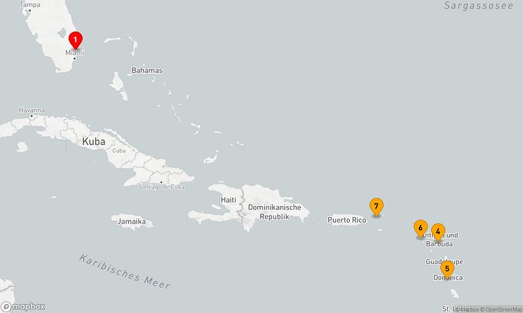Auf Ihrer Reise besuchen Sie unter anderem die Häfen von Fort Lauderdale, Saint John's und Basseterre, wo spannende Eindrücke von Land und Kultur auf Sie warten.