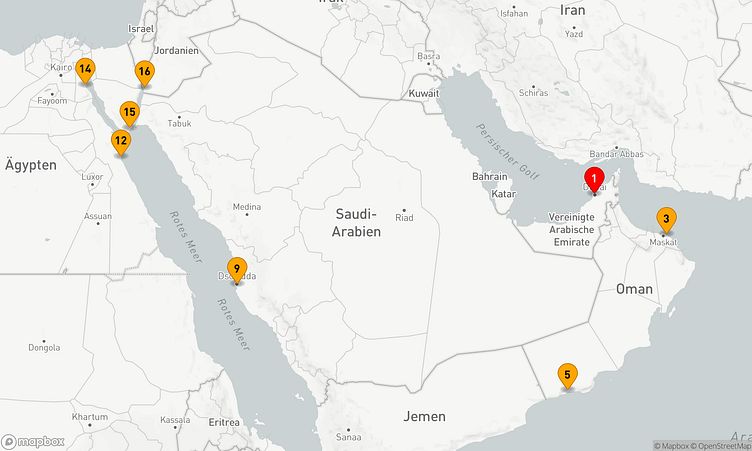 Ihre Reise beginnt in Dubai (Vereinigte Arabische Emirate). Am 08. Februar 2027 legen Sie ab und erreichen nach 17 Tagen, am 25. Februar 2027, den Hafen Dschidda (Saudi-Arabien).