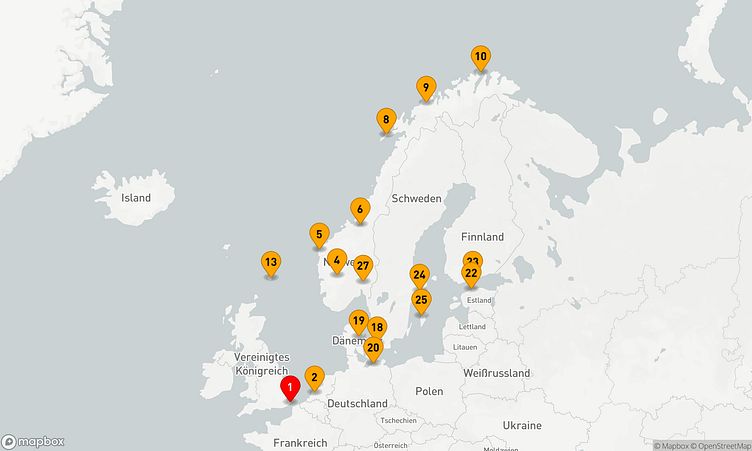 Ihre Route führt Sie unter anderem zu den faszinierenden Häfen von Dover, Trondheim und Lerwick, wo Sie die Atmosphäre und das Leben vor Ort spüren können.