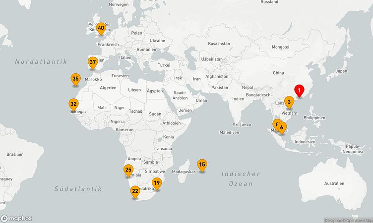 Die Reiseroute beginnt am 22. März 2026 in Hongkong (China) und führt Sie vom 22. März 2026 bis zum 30. April 2026 (39 Tage) nach Southampton (Vereinigtes Königreich).