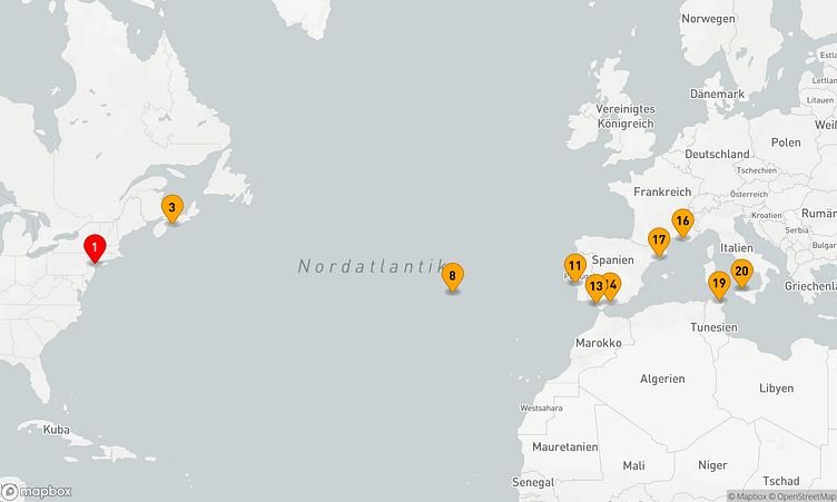 Ihre Reise startet in New York City (Vereinigte Staaten). Am 19. April 2026 legen Sie ab und erreichen nach 19 Tagen, am 08. Mai 2026, den Zielhafen Palermo (Italien).