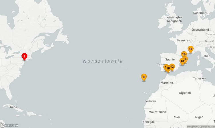 Sie starten Ihre 15-tägige Reise am 09. April 2026 in New York City (Vereinigte Staaten) und erreichen den Zielhafen Barcelona (Spanien) am 24. April 2026.