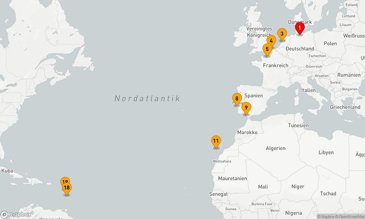 Ihre Reise startet am 08. November 2026 in Hamburg (Deutschland), und nach 18 Tagen erreichen Sie am 26. November 2026 den Hafen von Pointe-à-Pitre (Guadeloupe).