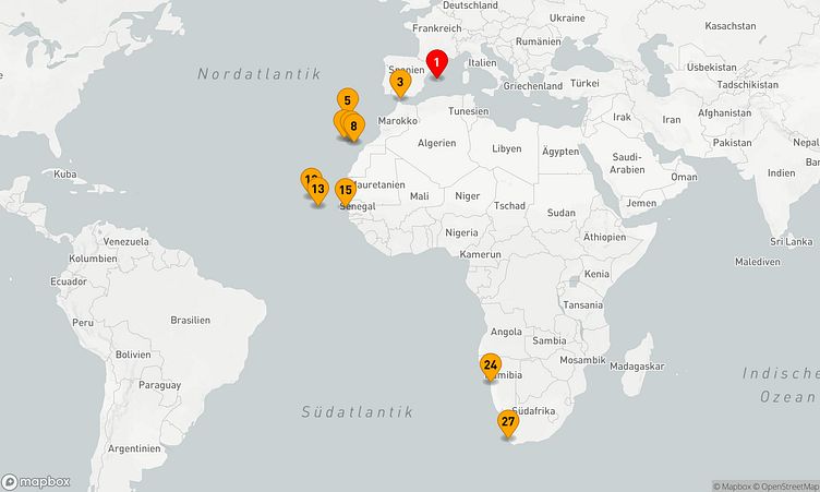 Ihre Reise startet in Palma de Mallorca (Spanien). Am 18. Oktober 2026 legen Sie ab und erreichen nach 27 Tagen, am 14. November 2026, den Zielhafen Kapstadt (Südafrika).