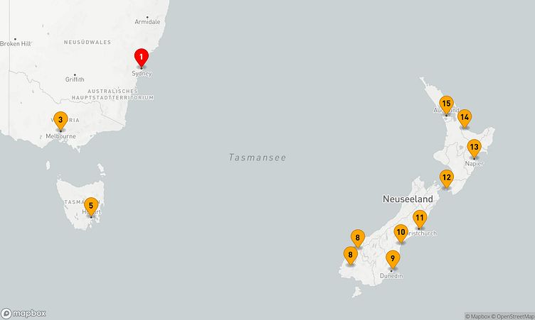 Ihre Route führt Sie unter anderem zu den faszinierenden Häfen von Sydney, Hobart und Port Chalmers, wo Sie die Atmosphäre und das Leben vor Ort spüren können.