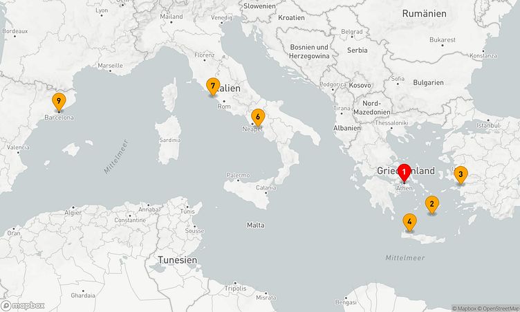 Während Ihrer Reise besuchen Sie unter anderem die Häfen von Athen (Piräus), Santorin und Chania, wo spannende Einblicke in Land und Kultur auf Sie warten.