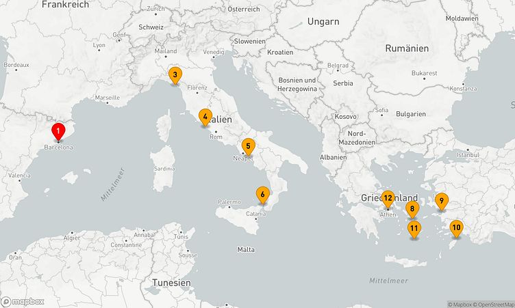 Ihre Reise beginnt in Barcelona (Spanien). Am 03. Mai 2027 heben Sie ab und erreichen nach 11 Tagen, am 14. Mai 2027, den Zielhafen Athen (Piräus) (Griechenland).
