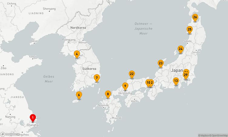 Am 09. März 2027 starten Sie in Shanghai (China) und legen nach 29 Tagen am 07. April 2027 in Tokyo (Yokohama) (Japan) wieder an.