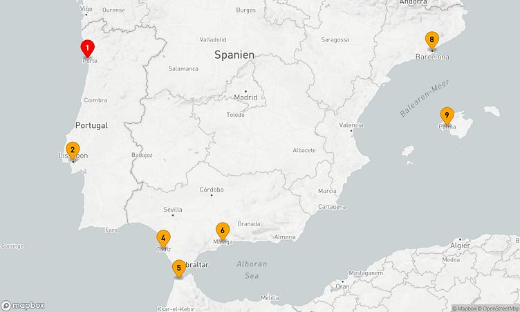 Ihre Reise startet in Leixoes / Porto (Portugal). Am 10. September 2026 legen Sie ab und erreichen nach 8 Tagen, am 18. September 2026, den Zielhafen Palma de Mallorca (Spanien).