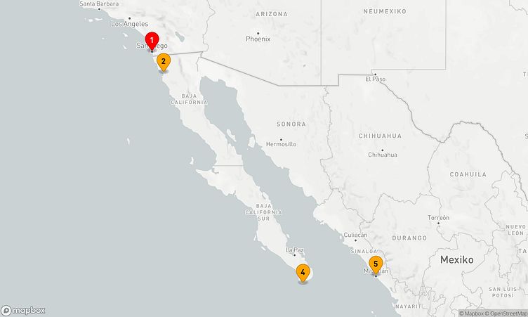 Ihre Route führt Sie unter anderem zu den faszinierenden Häfen von San Diego, Ensenada und Mazatlán, wo Sie die Atmosphäre und das Leben vor Ort spüren können.