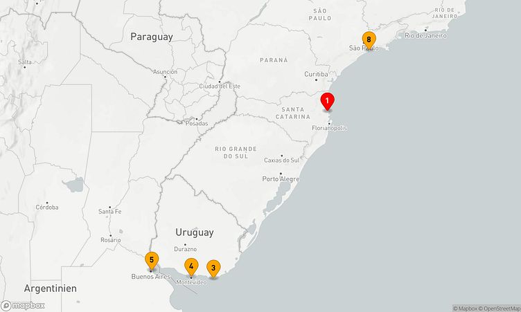 Ihre Route führt Sie unter anderem zu den faszinierenden Häfen von Balneário Camboriú, Montevideo und Buenos Aires, wo Sie die besondere Atmosphäre und das lokale Leben hautnah erleben können.