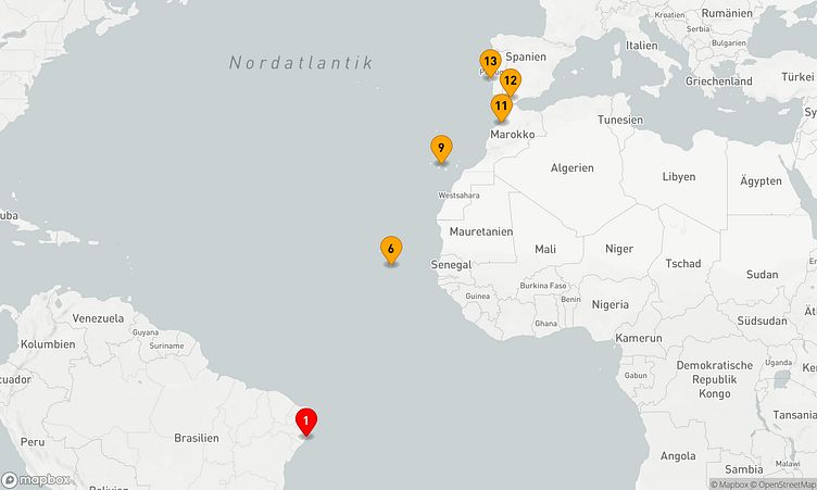 Nach Ihrem Start am 24. April 2026 in Maceió (Brasilien) führt Sie die Route über 12 Tage bis zu Ihrem Zielhafen Lissabon (Portugal), wo Sie am 06. Mai 2026 ankommen.