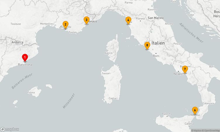 Während Ihrer Reise haben Sie die Gelegenheit, die Häfen von Barcelona, Marseille und Livorno zu erkunden, wo Sie einzigartige Einblicke in Land und Kultur gewinnen.