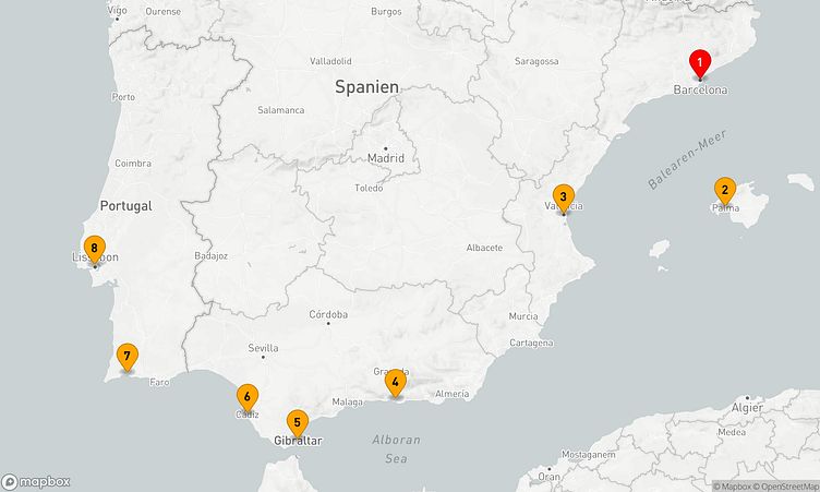 Ihre Route führt Sie unter anderem zu den faszinierenden Häfen von Barcelona, Palma de Mallorca und Motril, wo Sie die Atmosphäre und das Leben vor Ort spüren können.