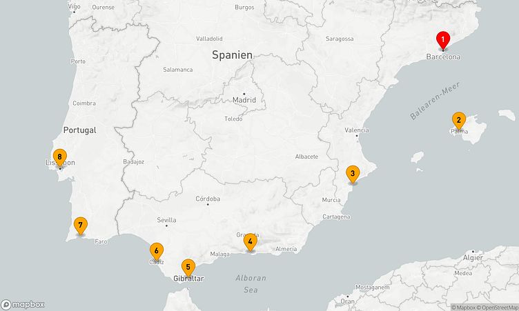Ihre Route führt Sie unter anderem zu den faszinierenden Häfen von Barcelona, Palma de Mallorca und Motril, wo Sie die Atmosphäre und das Leben vor Ort spüren können.