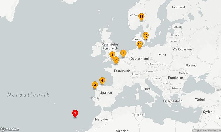 Ihre Route führt Sie unter anderem zu den faszinierenden Häfen von Funchal – Madeira, Gijón und Zeebrügge, wo Sie die Atmosphäre und das Leben vor Ort hautnah erleben können.