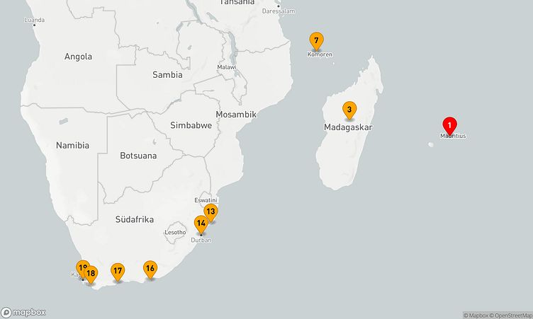 Die Reiseroute beginnt am 03. Dezember 2026 in Mauritius (Mauritius) und führt Sie vom 03. Dezember 2026 bis zum 21. Dezember 2026 (18 Tage) nach Kapstadt (Südafrika).