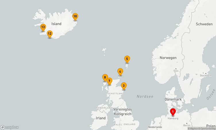 Ihre Reise startet in Hamburg (Deutschland). Am 10. Juni 2027 legen Sie ab und erreichen nach 13 Tagen, am 23. Juni 2027, den Zielhafen Reykjavík (Island).