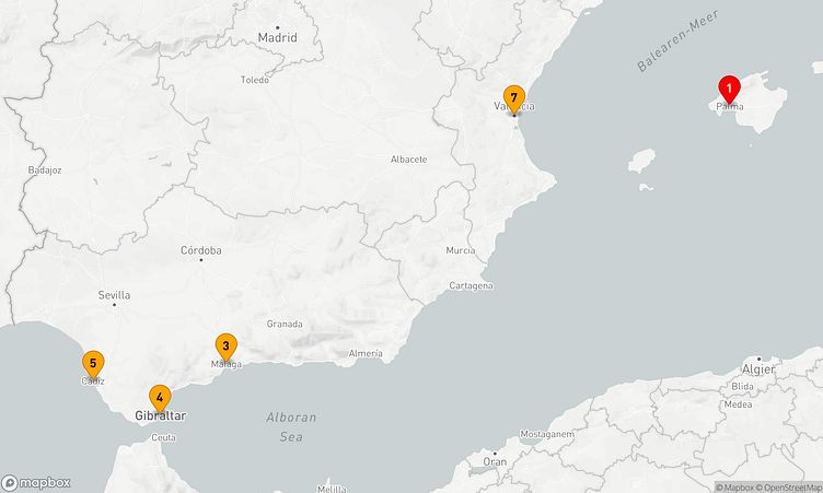 Während der Reise besuchen Sie unter anderem die Häfen von Palma de Mallorca, Malaga und Cádiz, die Ihnen spannende Eindrücke und einzigartige Entdeckungen bieten.
