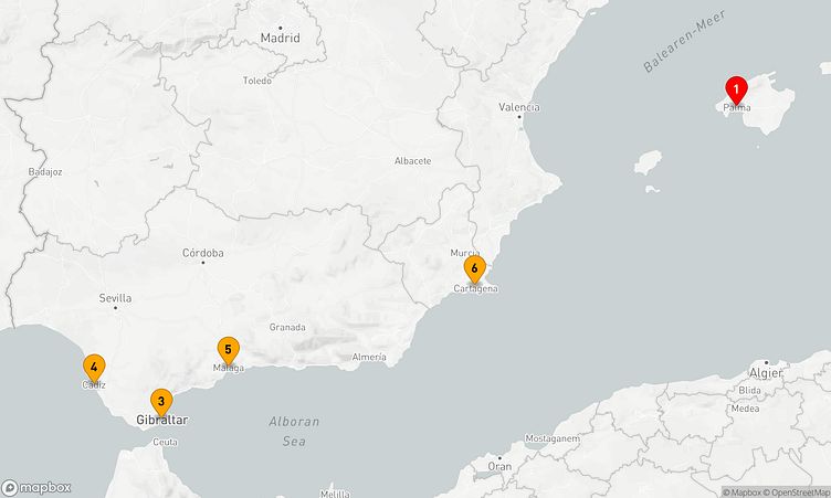 Auf Ihrer Reise besuchen Sie unter anderem die Häfen von Palma de Mallorca, Gibraltar und Malaga, wo spannende Eindrücke von Land und Kultur auf Sie warten.