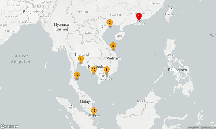Ihre Reise führt Sie zu den beeindruckenden Häfen von Hongkong, Vinh Ha Long und Sihanoukville, wo Sie die lebendige Atmosphäre und das lokale Leben hautnah erleben können.