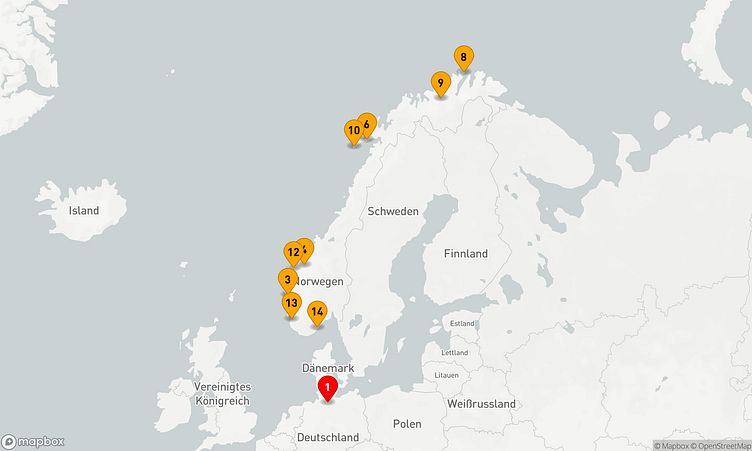 Auf der 15-tägigen Route „Fjorde und Polarlichter in Norwegen“ erwartet Sie eine unvergessliche Nordeuropa-Kreuzfahrt mit eindrucksvollen Landschaften und faszinierenden Eindrücken.