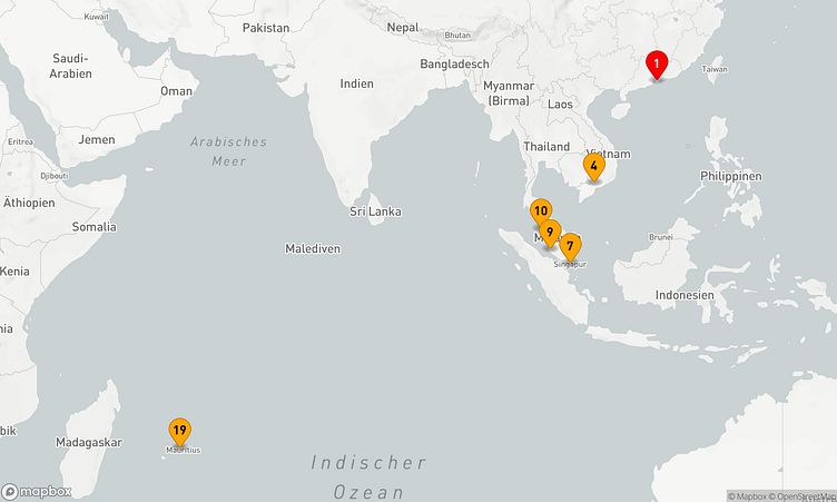 Am 02. Juni 2027 starten Sie in Hongkong (China) und legen nach 18 Tagen am 20. Juni 2027 in Port Louis (Mauritius) wieder an.