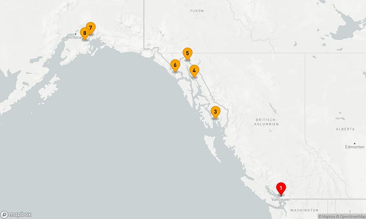Die Reise startet am 05. September 2027 in Vancouver (Kanada) und führt Sie vom 05. September 2027 bis zum 12. September 2027 (7 Tage) nach Whittier (Vereinigte Staaten).